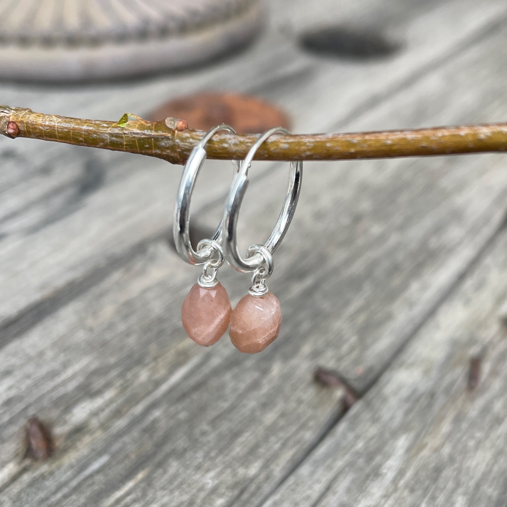 Hoops som pryds av en vacker, facetterad solsten som skimrar varmt i ljuset.