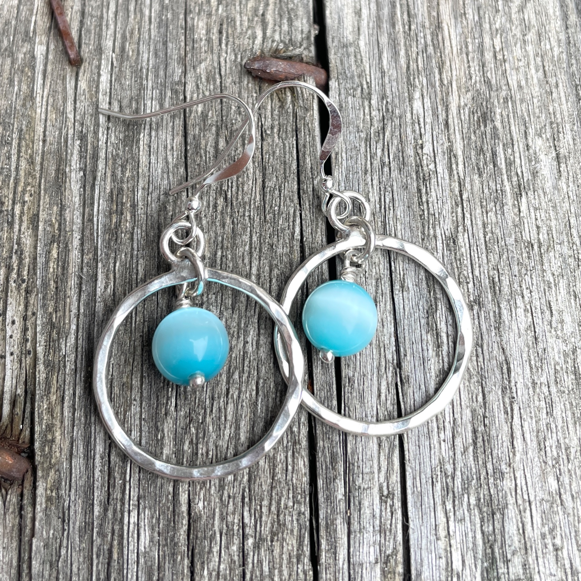 Lätt hamrad yta som fångar ljuset vackert, med en turkos cat eye pärla i mitten.