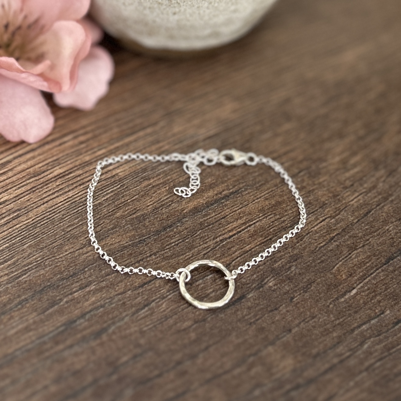 Handgjort armbanband i 925 sterling silver med en liten cirkel med lätt hamrad yta.