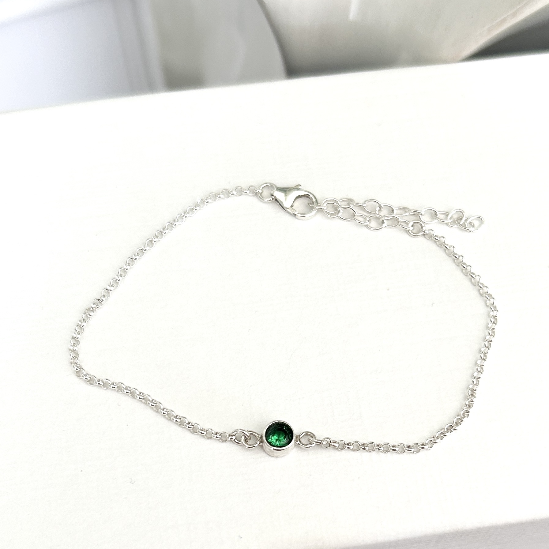 Ett nätt och stilrent armband i äkta silver, prytt med en liten infattad grön zirkon som ger ett diskret men elegant lyster. Den tunna kedjan tillsammans med den mjukt skimrande stenen skapar ett tidlöst smycke som passar lika bra till vardag som till fest.