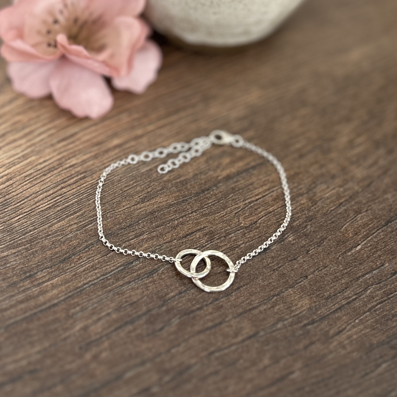 Handgjort armband i 925 sterling silver med två sammanlänkade cirklar i lätt hamrad finish.