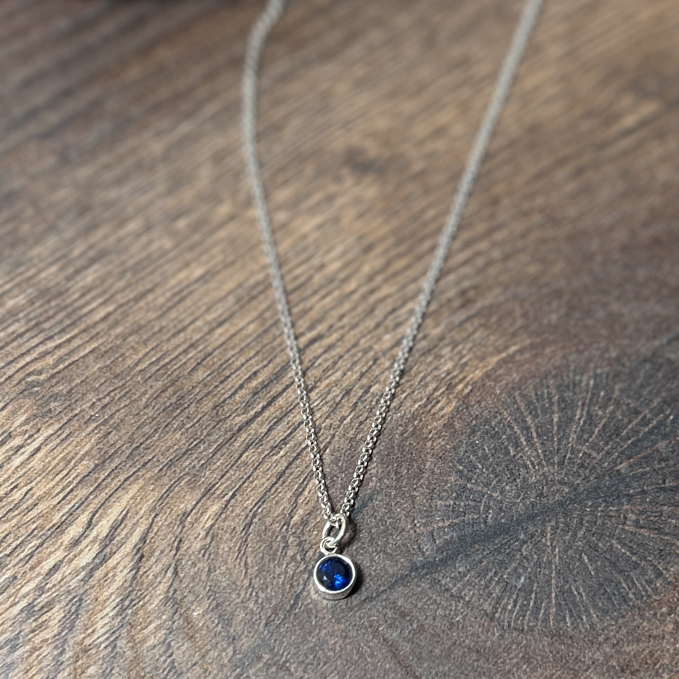 Ett nätt och tidlöst halsband i äkta silver, smyckat med en liten infattad blå zirkon som ger ett elegant och levande lyster. Den djupblå stenen skapar ett sofistikerat uttryck och ger smycket en vacker färgklick utan att ta över.