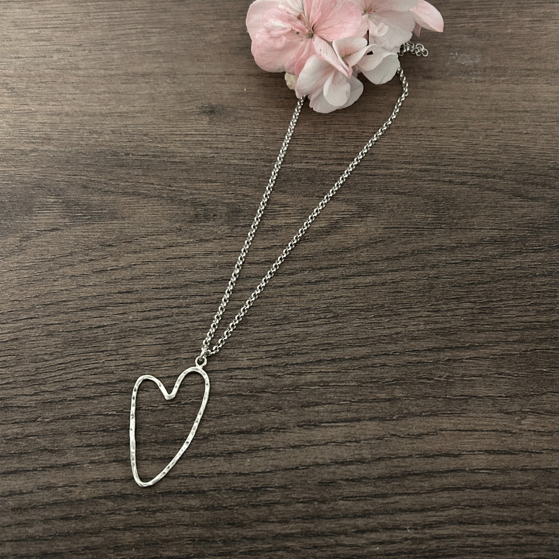 Ett vackert handgjort halsband med ett stilrent hjärta i 925 sterling silver. Hjärtat har en lätt hamrad yta som ger liv och karaktär åt smycket – enkelt, elegant och unikt.