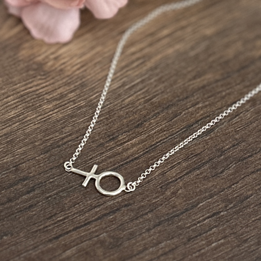 Handgjort halsband i 925 sterling silver med en liggande kvinnosymbol i stilren, minimalistisk design.