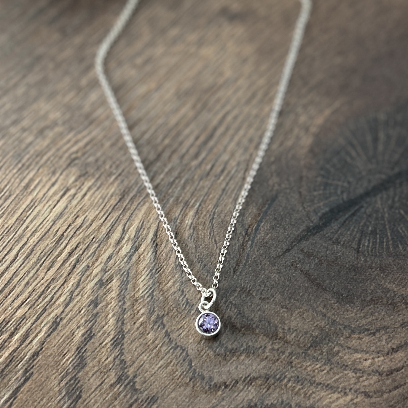 Ett nätt och tidlöst halsband i äkta silver med en liten infattad lila zirkon som skimrar vackert i ljuset. Den ljusa, lila tonen ger smycket ett mjukt och harmoniskt uttryck som passar lika bra till vardag som till fest.