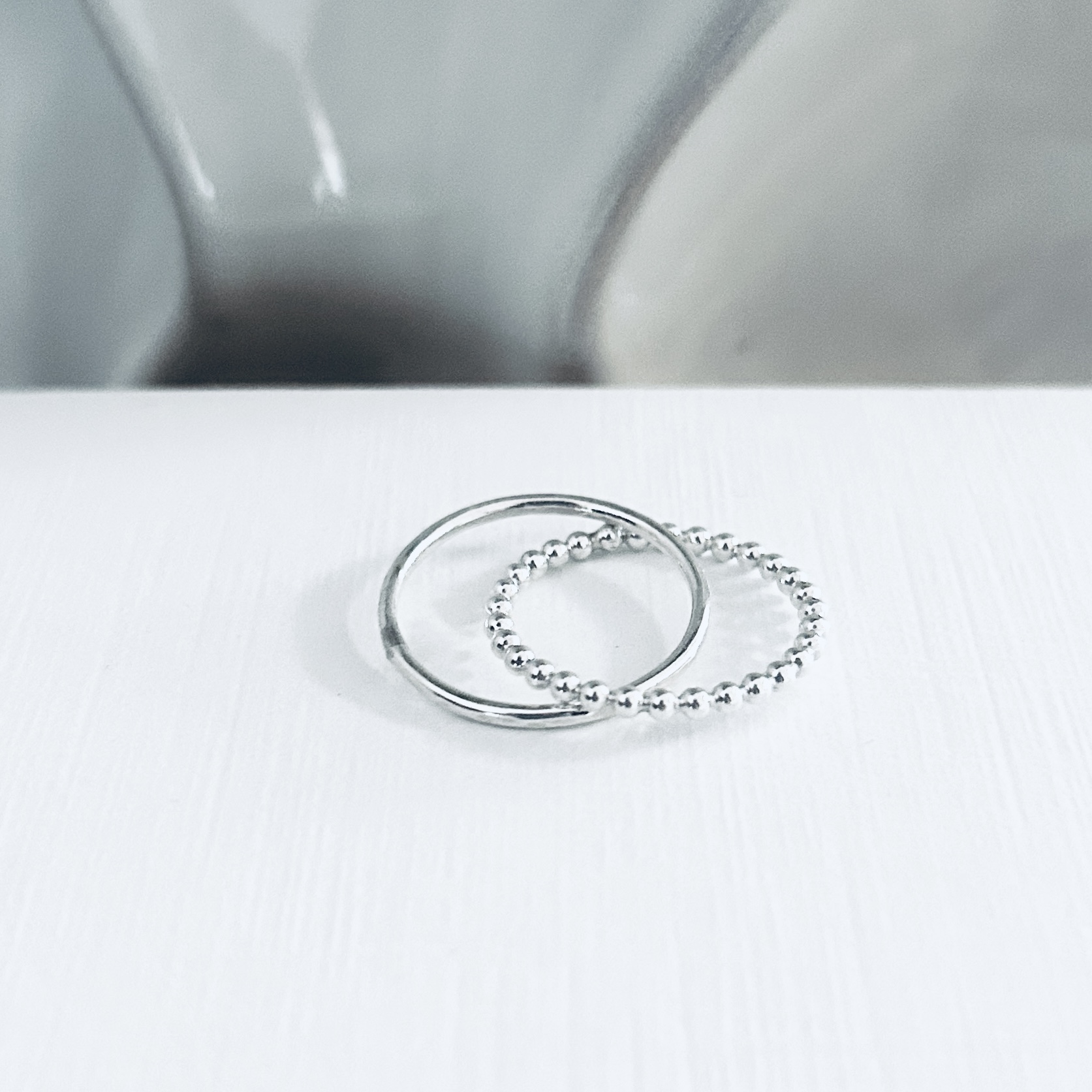 En unik ring i 925 sterlingsilver där två ringar sitter ihop – en i kultråd och en tunn hamrad ring. Kombinationen ger en fin kontrast mellan det mjuka och det råa.