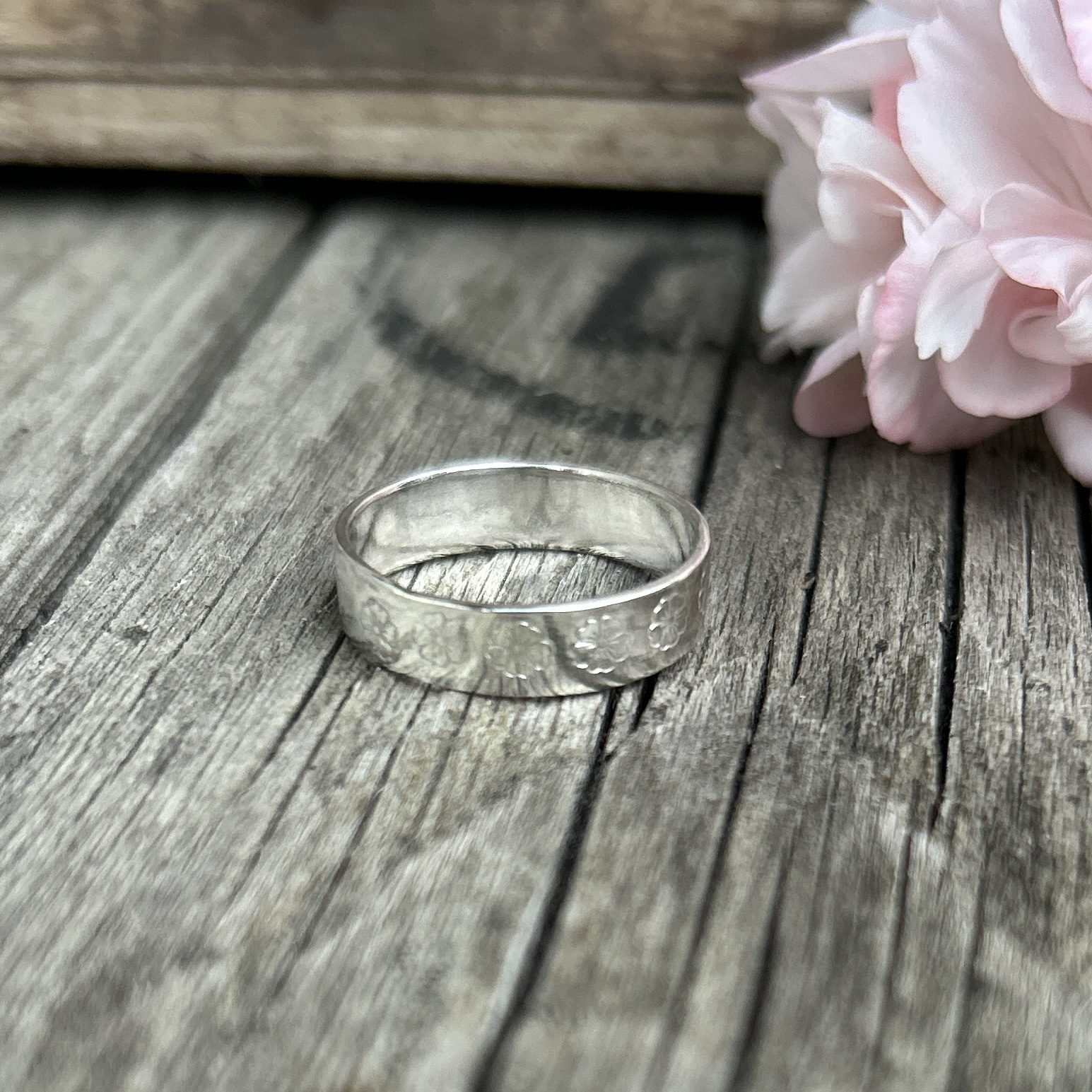 En 5 mm bred ring i 925 sterlingsilver, handgjord med vackra stansade blommor runtom.