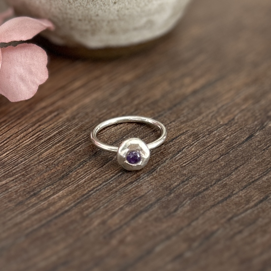 Handgjord ring i 925 sterling silver med en oregelbunden silverkula i återvunnet silver, infattad med en lila zirkon. Varje ring är unik – ingen är perfekt, och det är precis det som gör den speciell.