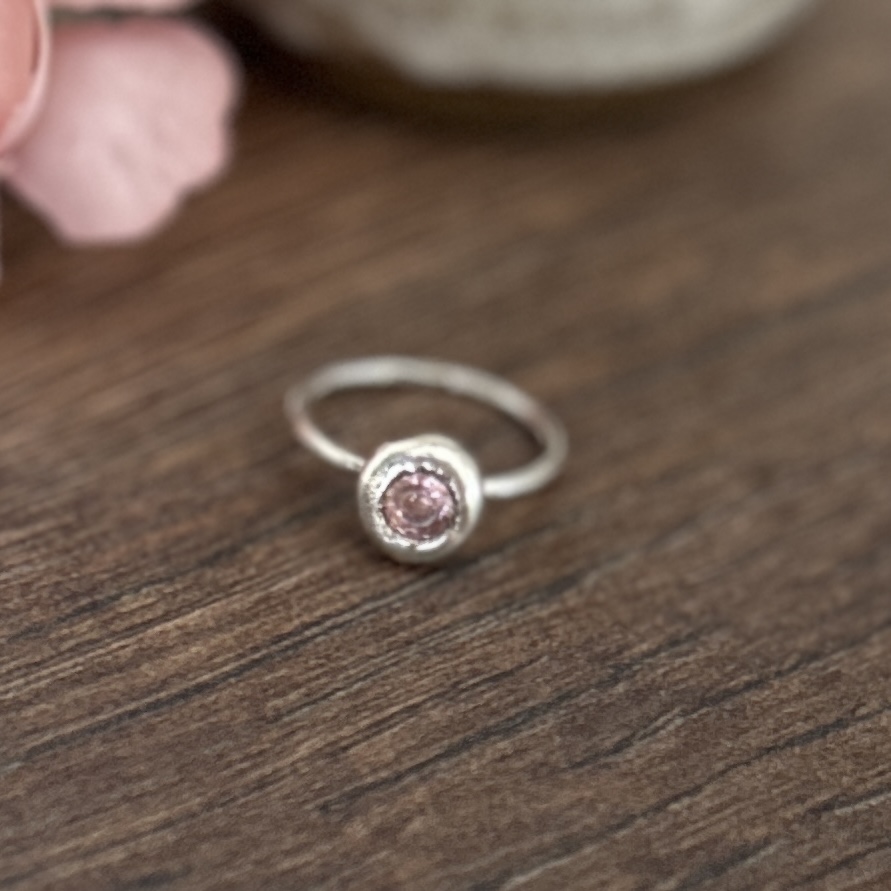 Handgjord ring i 925 sterling silver med en oregelbunden silverkula i återvunnet silver, infattad med en rosa zirkon. Varje ring är unik – ingen är perfekt, och det är precis det som gör den speciell.