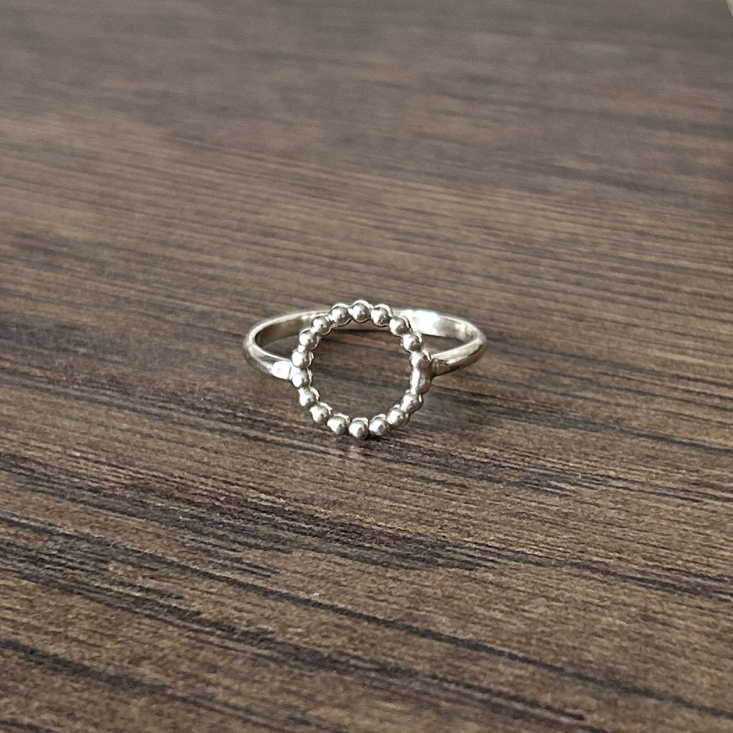 Den öppna formen ger ringen ett luftigt och stilrent uttryck, samtidigt som de små silverkulorna skapar liv och struktur.