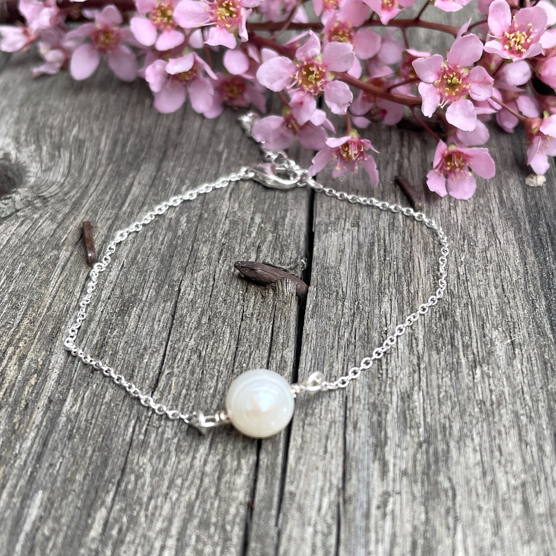 Ett elegant och tidlöst armband handgjort med en vacker sötvattenpärla som mittpunkt. Den tunna kedjan i 925 sterlingsilver ger ett lätt och stilrent uttryck som passar både till vardag och fest. Armbandet är enkelt att bära ensamt men går också fint att kombinera med andra smycken för en mer personlig stil.